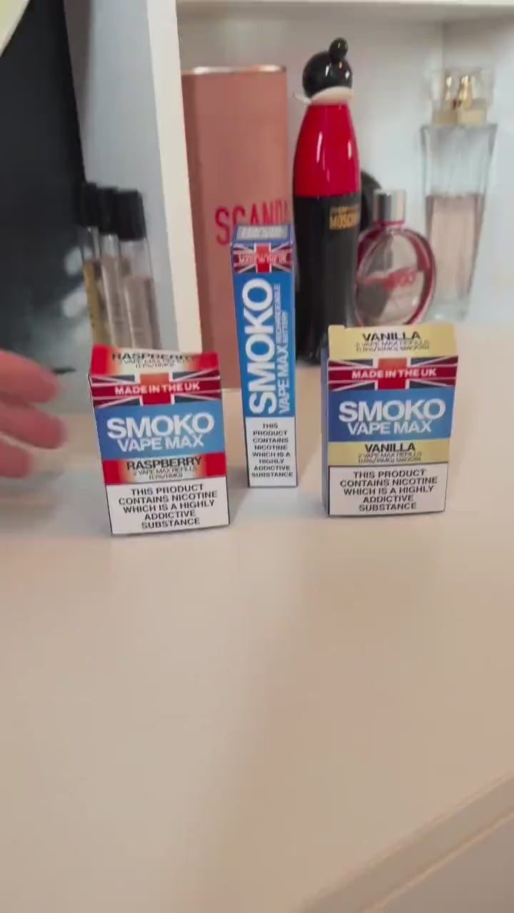 The VAPE MAX Starter Kit comes with a rechargeable battery with a Child Lock and a USB C Charging Cable. The SMOKO VAPE MAX uses the SMOKO VAPE MAX Refills, which come in 12 realistic flavours and wide range of nicotine strengths. Each pack of VAPE MAX refills replaces over 5 packs of tailor-made cigarettes.